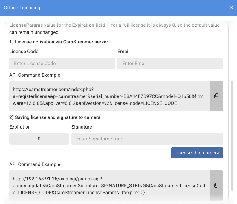 • Click License this camera, or paste the API command into a new browser window.