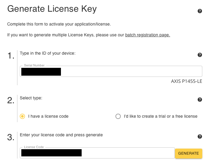Send the camera information and assign an unused license code to your camera on our server. A trial license or a full license can be obtained via our web page.