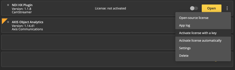 To license the app in an online environment, open the camera interface and navigate to Apps. Click the Options menu (three dots) next to the NDI HX Plugin app and select Activate license automatically.